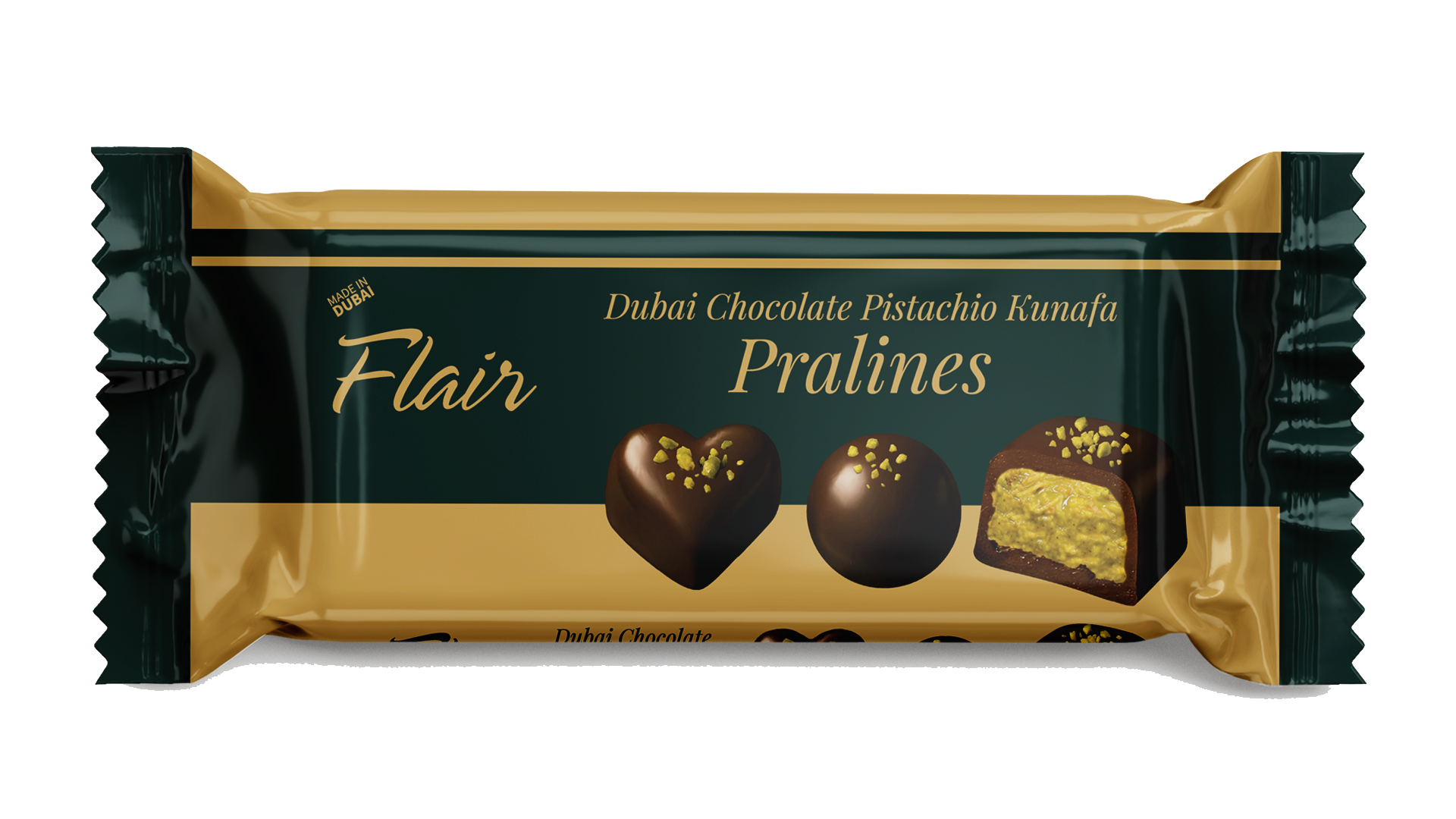 Flair Dubai Chocolate Pistachio Kunafa Pralines – A Luxurious Middle Eastern Fusion of Crunch, Cream & Chocolate. Elevate your sweet indulgence with a masterpiece of flavor and texture.