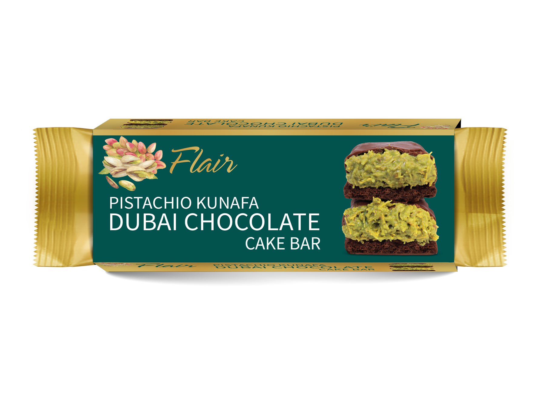 Delight in the exquisite fusion of flavors with Flair Dubai Pistachio Kunafa Chocolate Cake Bar. This premium dessert combines the nutty richness of pistachio kunafa with the smooth, velvety texture of chocolate cake, all wrapped in a luscious chocolate coating. Perfect for sharing, gifting, or personal indulgence.