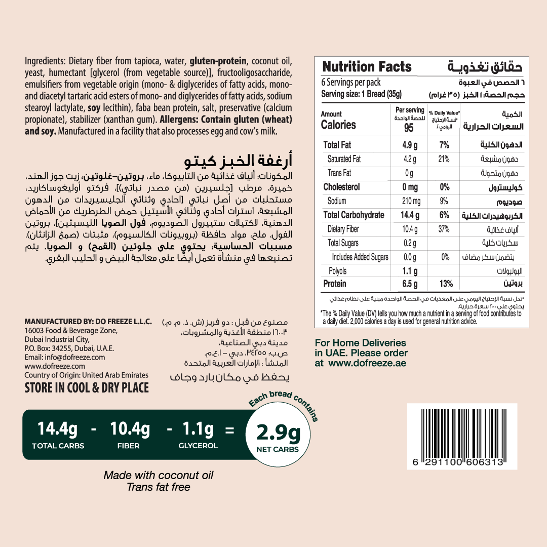 The bread loaves box includes 6 x 35g sandwich bread loaves, each made with plenty of fiber, no what flour, no added sugar and only 1g of digestible carbs.