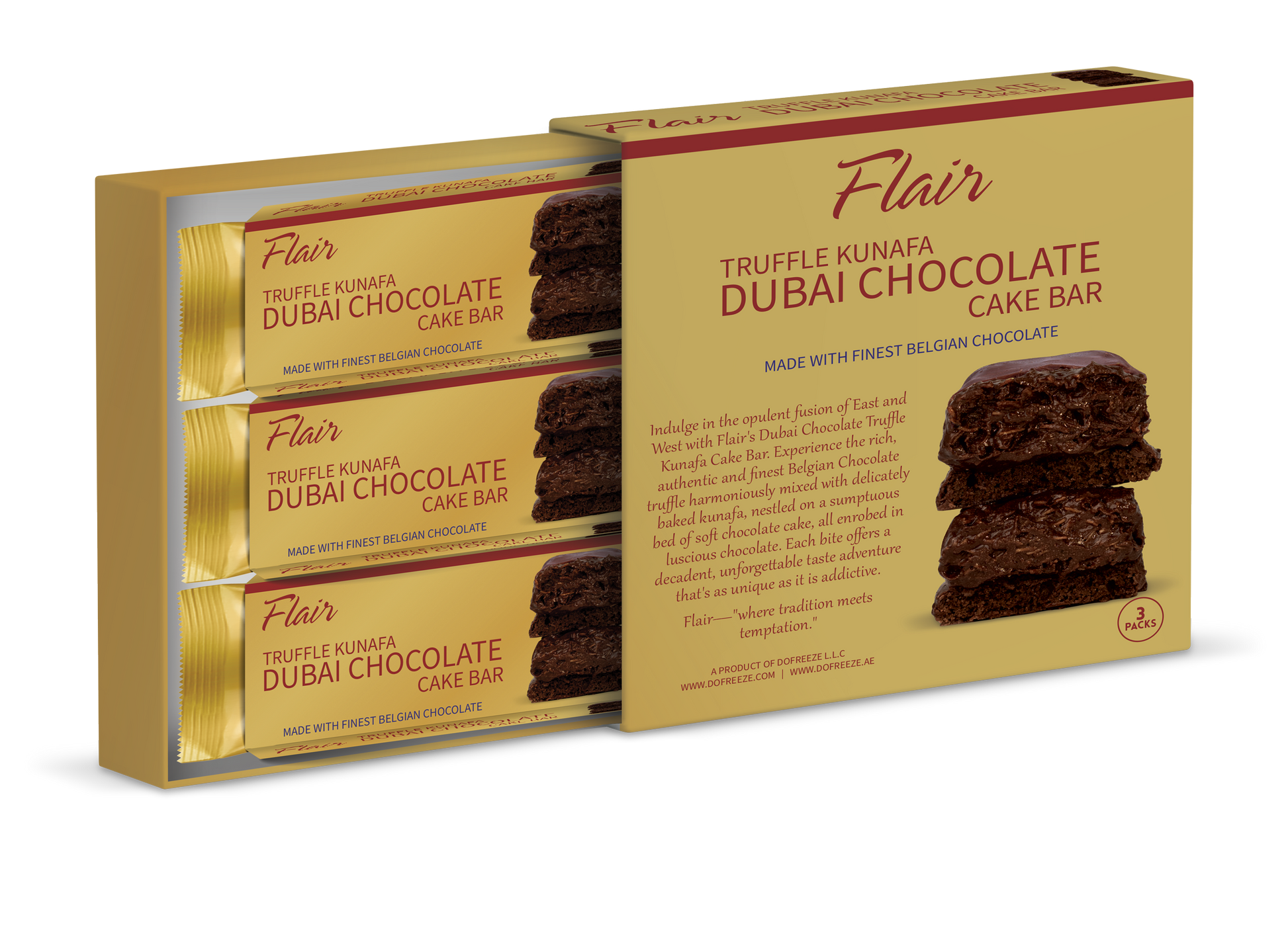 Discover the perfect blend of tradition and luxury with Flair Dubai Truffle Kunafa Chocolate Cake Bar. This premium dessert combines the crisp, golden strands of kunafa with a rich, velvety truffle chocolate filling, all enveloped in a smooth chocolate coating. Each bite offers a sophisticated and unforgettable taste experience.